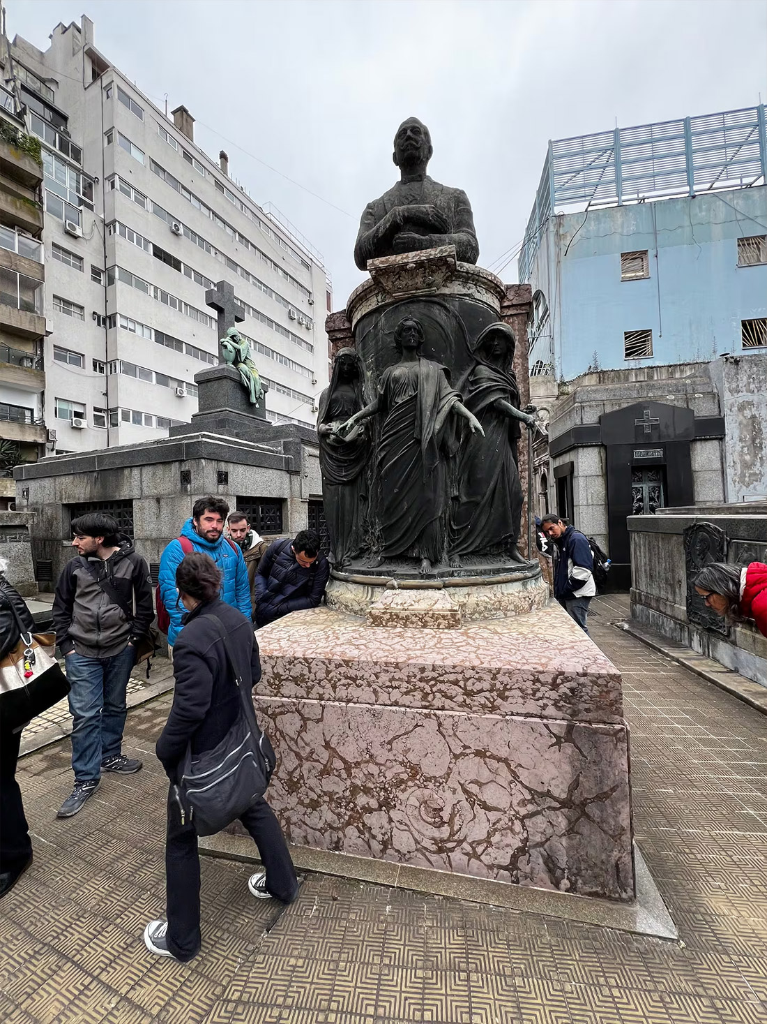 Vista frontal del monumento de José Figueroa Alcorta en el cementerio de la Recoleta. El basamento se encuentra revestido por una caliza rosada con amonoideos. Procedencia: Veneto (Italia). Edad jurásica, aprox. 165 millones de años antes del presente. (Foto: Darío G. Lazo.).