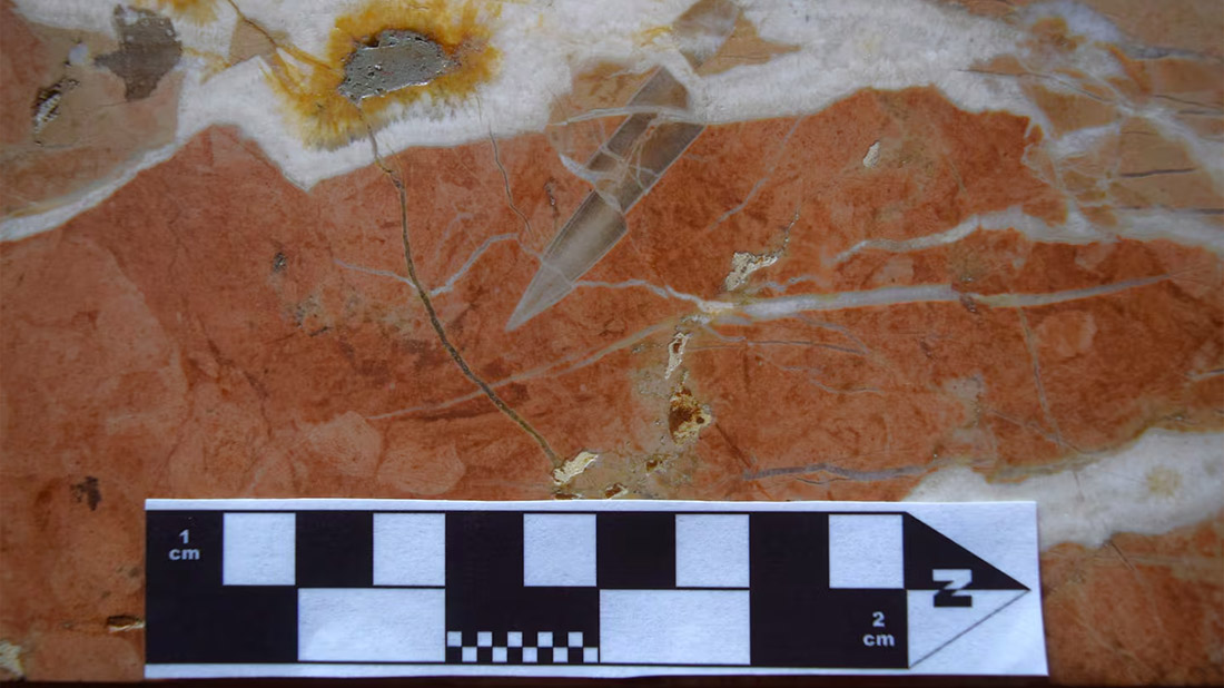Conchilla de belemnite atravesada por fracturas rellenas por calcita. Ubicación: recinto de Diputados. Procedencia probable de la roca: Alicante (España), edad jurásica (entre 200 y 145 millones de años antes del presente). (Foto: Departamento de Restauración de la Honorable Cámara de Diputados de la Nación.).