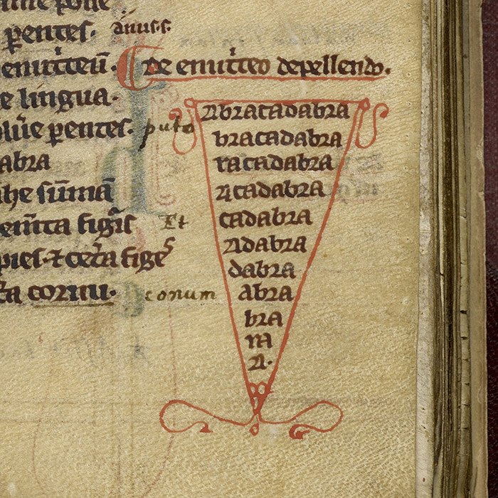 Un manuscrito del siglo XIII conserva la antigua «cura» romana de Quintus Serenus Sammonicus contra la malaria, con la palabra «abracadabra» escrita en letras decrecientes dentro de un triángulo invertido.