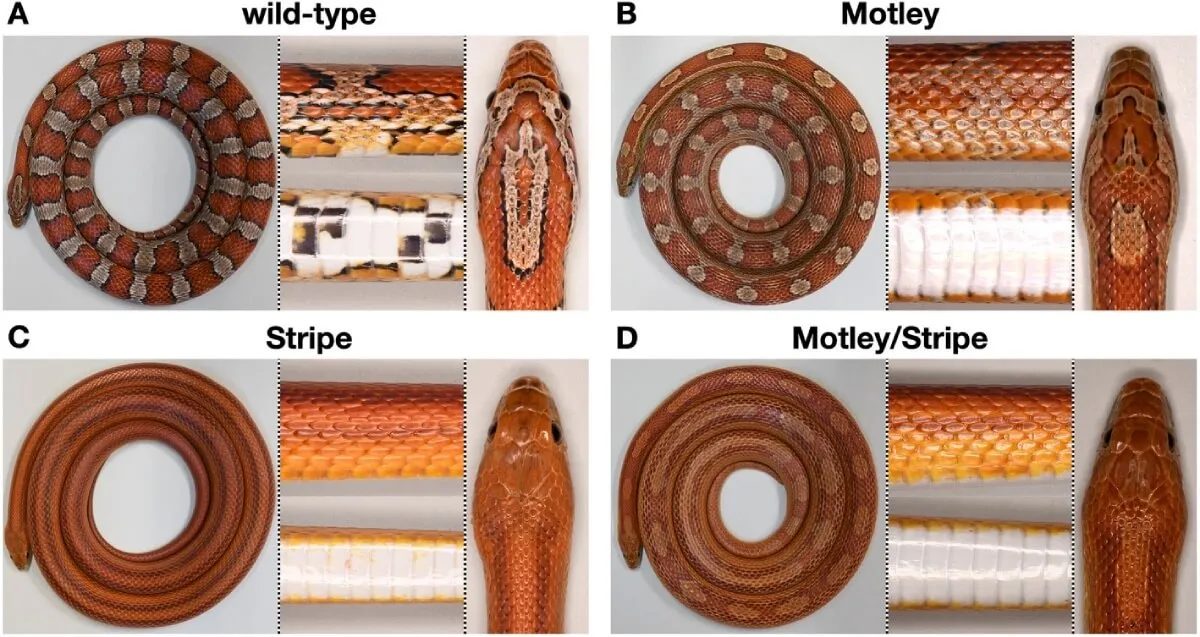 Patrones de color en serpientes del maíz: el patrón salvaje muestra manchas dorsales y laterales, mientras que las variantes Motley, Stripe y Motley/Stripe presentan alteraciones progresivas que transforman las manchas en franjas. Fuente: Genome Biology